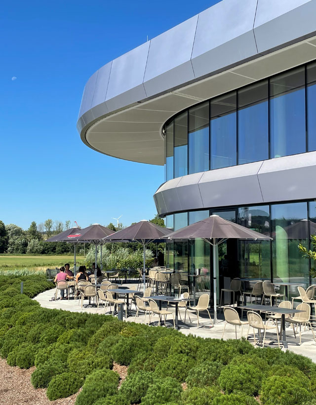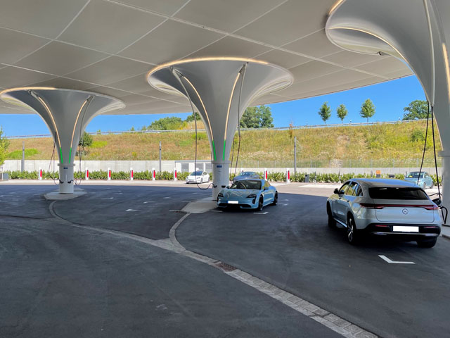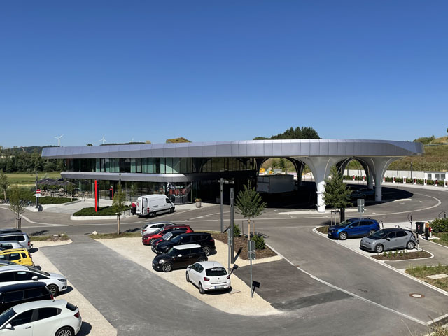 Dieses Gebäude ist nicht nur ein Gebäude, sondern auch ein wichtiger Schritt in Richtung E-Mobilität. Insgesamt 72 Ladepunkte, ein Schoppingbereich sowie Ausstellungs- und Schulungsräume runden das Gesamtkonzept ab. Bei Wartezeiten ist auch mit einem großen Kinderspielplatz in den Außenanlagen für die Kleinen gesorgt. Die begrünte Dachfläche sorgt überdies für einen Beitrag zur Artenvielfalt. Die an der A8 zwischen Augsburg und Stuttgart gelegene E-Tankstelle zeigt, wie die Zukunft des Tankens aussieht.